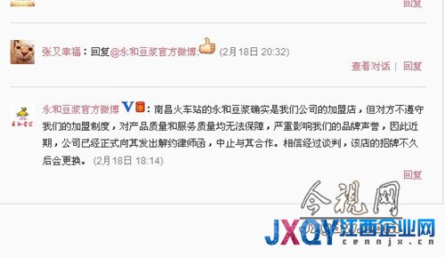 “南昌火車站的永和豆漿確實是我們公司的加盟店,但對方不遵守我們的加盟制度,對產品質量和服務質量均無法保障,嚴重影響我們的品牌聲譽,因此近期,公司已經正式向其發出解約律師函,終止與其合作。相信經過談判,該店的招牌不久后會更換。”2013年2月,永和豆漿官方微博首次發出終止合作說明。
