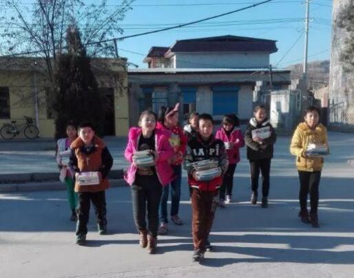 山西省汾陽市栗家中心校桑棗坡小學(xué)的學(xué)生,迎接新到的一批圖書