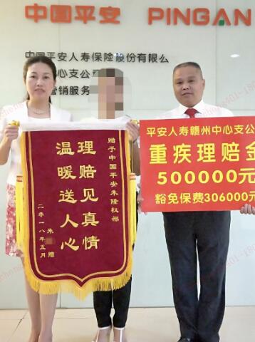 據悉,2016年12月18日,客戶周女士為愛人劉先生投保平安福至尊版險種,2018年4月初,客戶劉先生確診為直腸癌。平安人壽贛州中支理賠人員接到報案后立即聯系客戶了解詳細情況,細心指導客戶收集理賠材料,并安排保單服務人員上門協助客戶收集材料并通過口袋E上傳資料申請重大疾病理賠,經核實確定后,公司隨即按條款約定賠付重疾保險金50萬元,豁免后續保費共計30.65萬元。