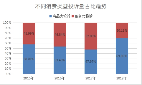 2018年,僅12315熱線共受理商品類投訴18711件,占12315熱線受理投訴總量的69.89%,同比增長70.57%;服務類投訴8061件,占12315熱線受理投訴總量的30.11%,同比下降32.25%。