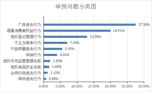 (二)受理舉報總量同比翻番,廣告違法、侵害消費者權益及違反登記管理規定的舉報占總量的六成。