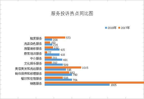服務類投訴排在前三位的是:銷售服務(1805件)、餐飲和住宿服務(764件)、制作保養和修理服務(760件),分別占服務類投訴總量的22.39%、9.48%、9.43%,合計占服務類投訴總量的41.3%。