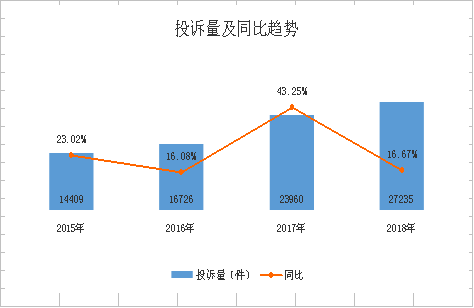 2018年,全市共受理消費者投訴27235件,占全部訴求總量的30.73%,同比增長16.67%。