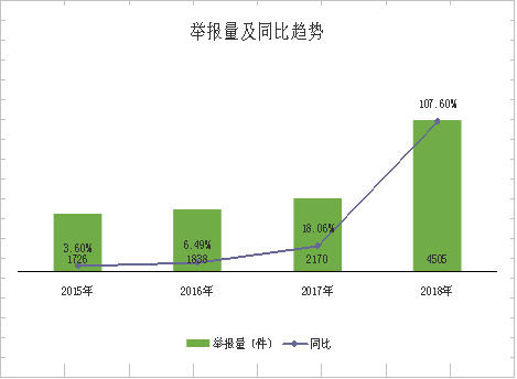 2018年,全市共受理舉報4505件,占全年訴求總量的5.09%,同比增長107.6%。從舉報反映的問題來看,涉及廣告違法行為(1239件)、侵害消費者權益行為(897件)、違反登記管理行為(585件)的舉報量排名前三,分別占舉報總量的27.5%、19.91%、12.99%,合計占總量的60.4%。