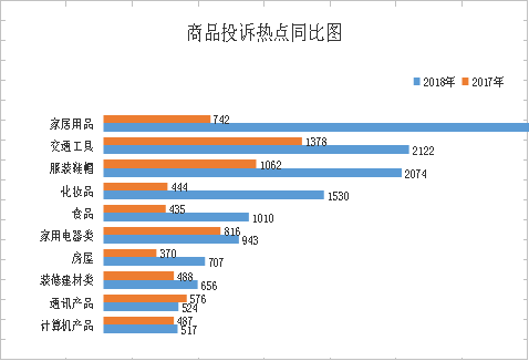 商品類投訴排在前三位的是:家居用品(3250件)、交通工具(2122件)、服裝鞋帽(2074件),分別占商品類投訴總量的17.37%、11.34%、11.08%,合計占商品類投訴總量的39.79%。從增幅來看,家居用品、化妝品、食品增幅較大,同比分別增長338.01%、244.59%、132.18%。