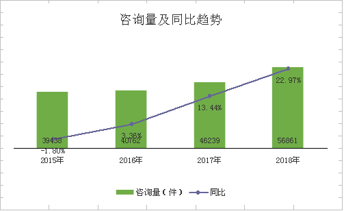 2018年,全市共受理消費者咨詢56861件,占全年訴求總量的64.16%,同比增長22.97%。以咨詢的問題分類,涉及法規咨詢(54854件)、消費咨詢(1490件)、業務咨詢(167件)分別占咨詢總量的96.47%、2.62%、0.29%,合計占咨詢總量的99.38%。