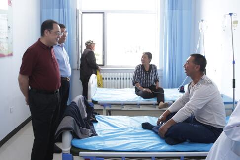 中國人壽壽險黨委委員、監事長、機關黨委書記賈玉增與大六號鎮衛生院就醫村民親切交談
