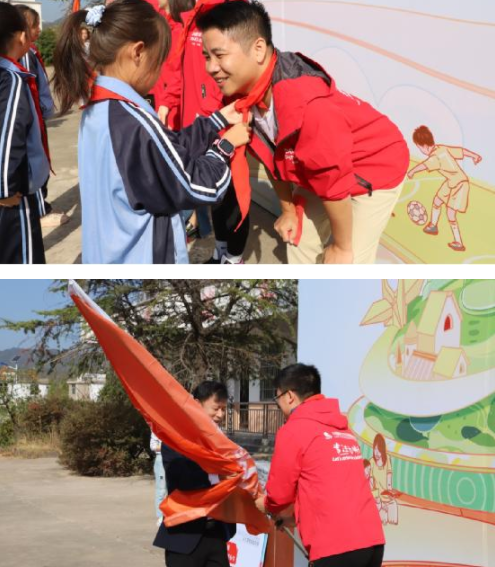 隨后,上饒市楓嶺頭平安希望小學(xué)的少先隊(duì)員為志愿者們系上了代表著紅旗一角的紅領(lǐng)巾,承載著同學(xué)們的熱情與期待。志愿者們從上饒市楓嶺頭中心小學(xué)小學(xué)陳朝欽書記手中接過了代表著期望與責(zé)任的志愿者旗幟,更是接過了一份責(zé)任,一份擔(dān)當(dāng)。志愿者們?cè)谄鞄孟虑f嚴(yán)宣誓,許下奉行志愿者宗旨,踐行志愿者精神的諾言。