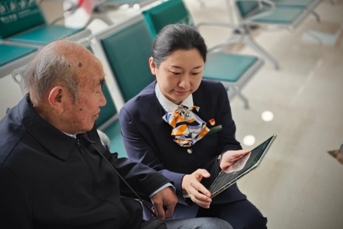 圖:客服大廳內工作人員使用Pad為老年客戶辦理業務