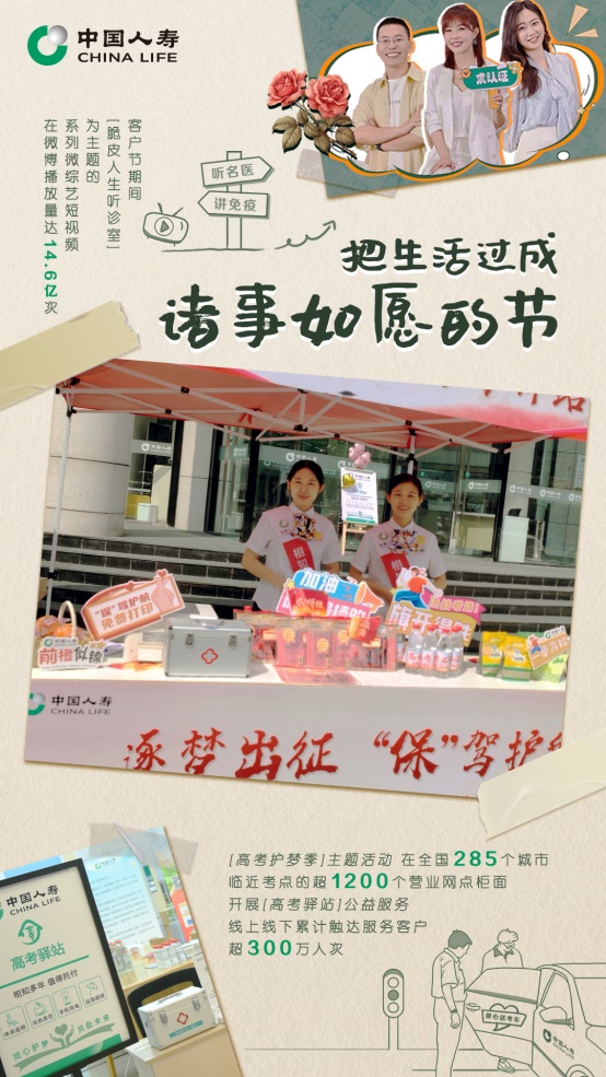 客戶節期間恰逢一年一度的高考季,十年苦讀筑夢,終要一鳴驚人。為滿足家有考生客戶的切身需求,國壽壽險與廣大考生暖心相聚,推出“高考護夢季”主題活動,聚焦“考前+考中+考后”的高考全鏈路,在全國285個城市臨近考點的超1200個營業網點柜面開展“高考驛站”公益服務,為考生及家長保駕護航。圍繞“名師指導show未來”,以“線上直播答疑+線下講座咨詢”為主線,打造高考志愿填報科普“志”囊團。在江蘇、湖南、湖北、河南、陜西、內蒙古、廣西、北京開展“閃光8城”線下志愿填報巡講活動,同步在北京、南京小范圍探索開展“985直通車”一日游學活動。線上線下累計觸達服務客戶超300萬人次。將優勢資源與服務送至客戶身邊,暖心守護考生夢想之路。