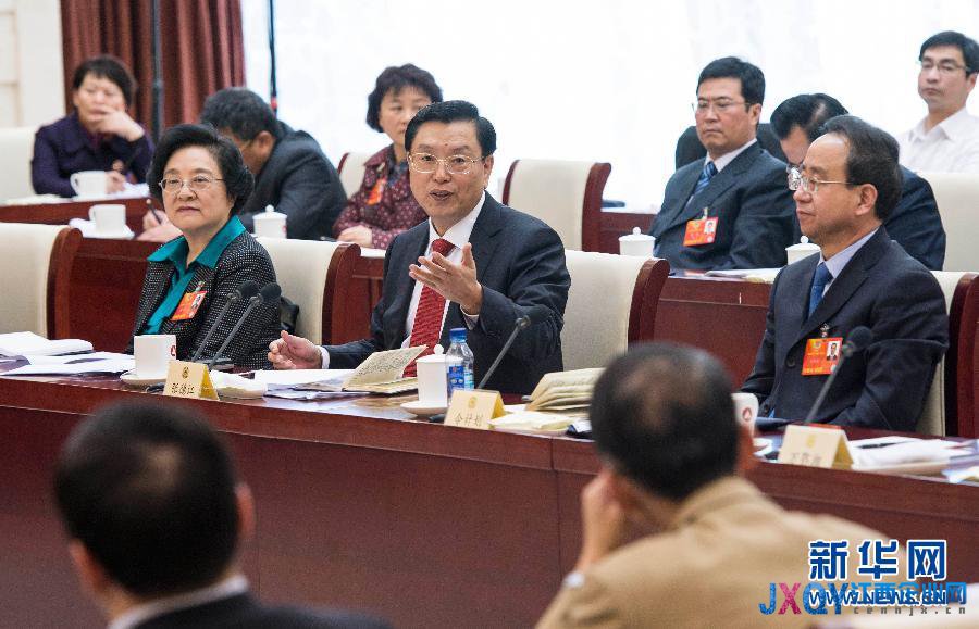 3月4日,中共中央政治局常委、國務院副總理張德江看望出席全國政協十二屆一次會議的民革、臺盟、臺聯界委員并參加聯組會。 新華社記者 王曄攝