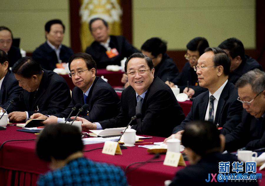 3月4日,中共中央政治局常委、全國政協十二屆一次會議主席團會議主持人俞正聲看望出席全國政協十二屆一次會議的中共界委員并參加聯組會。新華社記者 李學仁 攝