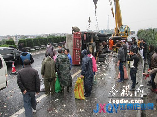 11日凌晨,滬昆高速一輛浙江牌照運魚車側翻,大量活魚灑落一地