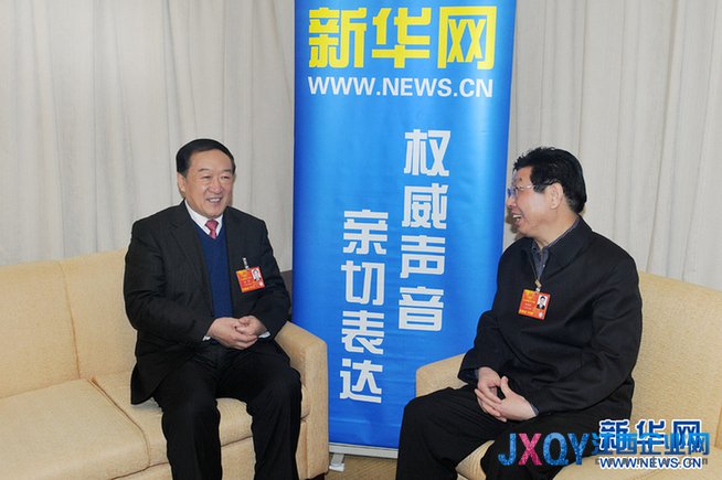 全國政協副主席、全國人大代表、江西省委書記、江西省人大常委會主任蘇榮13日接受新華網專訪。圖中左為蘇榮,右為全國人大代表、新華社江西分社社長王運才。新華網 翟子赫 攝