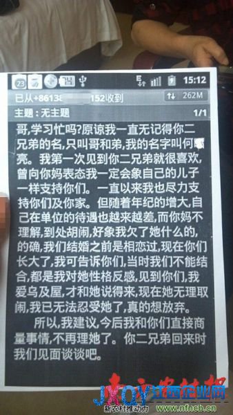 而在李梅提供的一條由何某亮手機發(fā)給她兩個兒子的短信中,何某亮則說:“我第一次見到你二(兩)兄弟就很喜歡,曾向你媽表態(tài)我一定會象(像)(對)自己的兒子一樣支持你們……今后我和你們直接商量事情……”