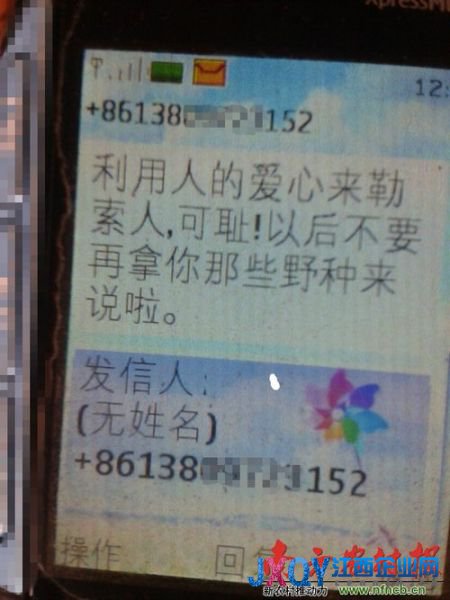 然而,圍繞小孩的撫養(yǎng)費問題,李梅與何某亮的矛盾并未就此了結(jié)。李梅向記者展示的一條短信顯示:“利用人的愛心來勒索人,可恥!以后不要再拿你那些野種來說啦。”經(jīng)與何某亮所在單位有關(guān)人員核對,發(fā)信號碼為何某亮常用手機號。李梅說,“何某亮怎么能罵自己的孩子為野種呢?”