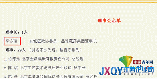 #p#副標題#e#點擊右下側(cè)的永定文化交流促進會,便進入北京市東城區(qū)永定文化交流促進會的官方網(wǎng)站,其中在"促進會簡介"中有這樣的文字:"北京市東城區(qū)永定文化交流促進會是在北京市東城區(qū)文化委員會領(lǐng)導下并在北京市東城區(qū)民政局登記注冊的社團組織。""北京市東城區(qū)永定文化交流促進會最高決策機構(gòu)為理事會。理事會由理事會、顧問委員會組成,并設(shè)有監(jiān)事會。理事會設(shè)有名譽理事、理事長、副理事長和理事。""北京東城區(qū)永定文化交流促進會已建設(shè)了永定書院、永定會所、永定國禮展廳、永定小劇場等文化活動和設(shè)施。"在北京市東城區(qū)永定文化交流促進會官網(wǎng)上的"組織架構(gòu)"欄目中,赫然寫著理事長為東城區(qū)政協(xié)委員、晶珠藏藥集團董事長李訪瑞。