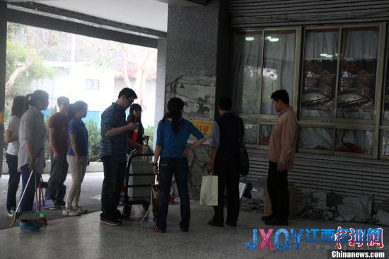 3月27日,南投地震發(fā)生截至當(dāng)日下午5時(shí)30分,已造成1人死亡、86人受傷,各縣市中,以臺(tái)中市58人受傷最多。圖為臺(tái)中中興大學(xué)一群大學(xué)生在加緊清理墻上掉落的石板、碎片。該大學(xué)圖書館在1999年的9.21大地震中曾倒塌,今次地震發(fā)生后,臨時(shí)停課一天。中新社發(fā)董會(huì)峰攝