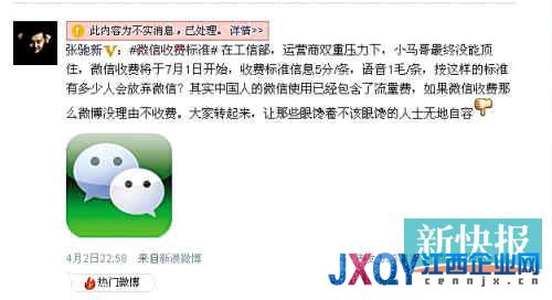 該微博將近日流傳的三種收費方式制作成圖片列舉,其中包括“微信收費將于7月1日開始,收費標準信息5分/條,語言1毛/條”、“包月用戶會員制度,每月繳納10元可不限量發送微信”以及“今年下午6點以后開微信要$25,將信息傳給10個人證明是頻繁使用微信用戶可免費升級”等內容。