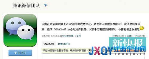 微信是否該收費的爭論近日鬧得沸沸揚揚,據昨日中央電視臺新聞中心官方微博“央視新聞”報道,工信部就微信收費給出了更確切表態,稱收費是肯定的,如何收費還在研究中。不過同日,微信在新浪和騰訊微博上的官微也發出了辟謠帖,宣稱近日在網絡上被瘋傳的三種收費方式都是純謠言。