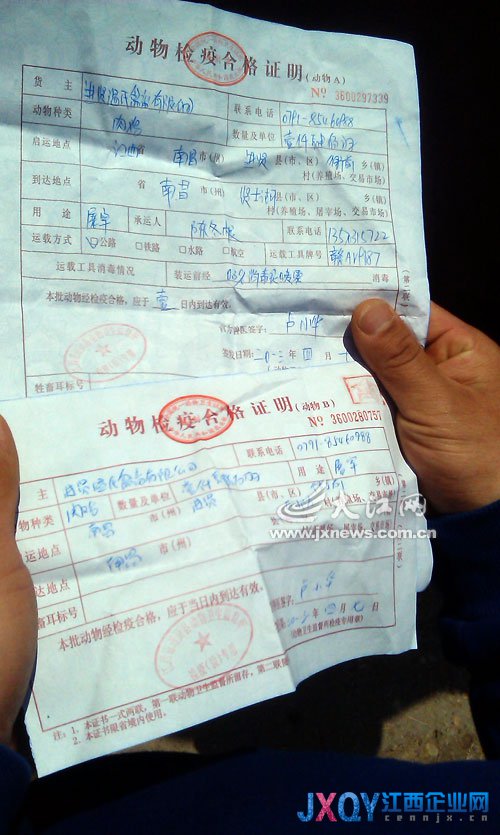 為了證明自己家的雞沒有問題,小陳還向記者出示了“動物檢疫合格證明”,并稱現在南昌市動物檢驗檢疫部門每天都會來人檢查,每天都要求他們清掃雞舍、加強消毒等。