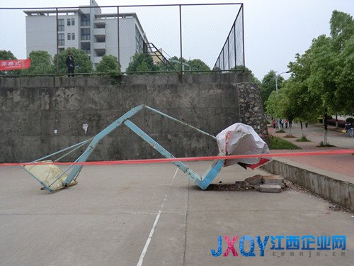 當日下午17:00,記者趕到井岡山大學事發籃球場地,倒地籃球架還在現場,肉眼識別籃球架年久失修,略顯陳舊,其他三個籃球架都已經貼上告示“籃架急需維修,不得使用,禁止一切練習活動!”