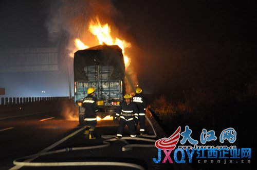 8日21時52分,泰和縣大廣高速往吉安方向一輛裝滿家具的貨車突然起火,司機在慌亂中撥打了報警電話。大隊接警后迅速出動兩輛消防車12名官兵趕赴現(xiàn)場救援。22時02分,救援人員到達(dá)現(xiàn)場后看到,貨車車身全部被火焰吞噬,大火正處于猛烈燃燒階段并逐漸向油箱蔓延,如不及時控制住火勢,溫度過高引起爆炸,后果不堪設(shè)想。