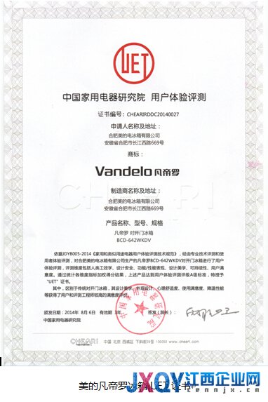 江西企業網訊 通訊員 柯可 報道 日前,由中國家用電器研究院主辦的2014年冰箱行業用戶體驗指數發布暨冰箱產品用戶體驗評測發布會在京召開,美的、西門子等國內外知名冰箱品牌企業參與測評。此次測評中,共有11家冰箱制造企業的15款產品通過產品并獲得“UET”證書。其中,美的凡帝羅642WKDV對開門冰箱通過此次“用戶體驗測評”并獲得“UET”證書。