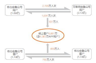 注:橫向遷徙指核心金融公司的互聯(lián)網(wǎng)服務平臺的用戶與互聯(lián)網(wǎng)金融公司的用戶間相互遷徙以及核心金融公司客戶間的相互遷徙。縱向遷徙指核心金融公司客戶向互聯(lián)網(wǎng)用戶的轉化以及互聯(lián)網(wǎng)用戶向核心金融公司客戶的轉化,詳細數(shù)據(jù)見公司業(yè)績報告。