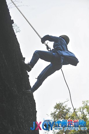江西企業網3月13日贛州訊 近來,一種獨特的紅色體驗拓展訓練活動在贛州悄然興起并受到青睞。圖為3月10日,贛州市人民醫院的醫護人員在興國接受這種紅色體驗拓展訓練時,從當年紅軍壯士跳崖處往下滑降,感受當年紅軍堅定的革命信仰和壯烈情懷。記者劉念海特約記者段德正攝