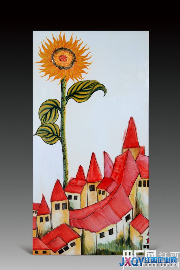 在她的向日葵系列瓷板畫作品中,有一幅被蘇姍列為“非賣品”的,是作者比較滿意的作品之一,畫面上呈現的是一排別致的鄉間小屋與極其高大的向日葵——它們的個頭甚至高過了小屋。這并非是荒誕的超現實主義繪畫,而是取材于真實事件,英國一戶人家培育出了高達8米的向日葵,其高度確實超越了自家的小別墅。蘇姍認為這件事充分體現出向日葵的生命本質,那就是對光明的向往與追逐,那是一股令人欽佩的向陽的力量。
