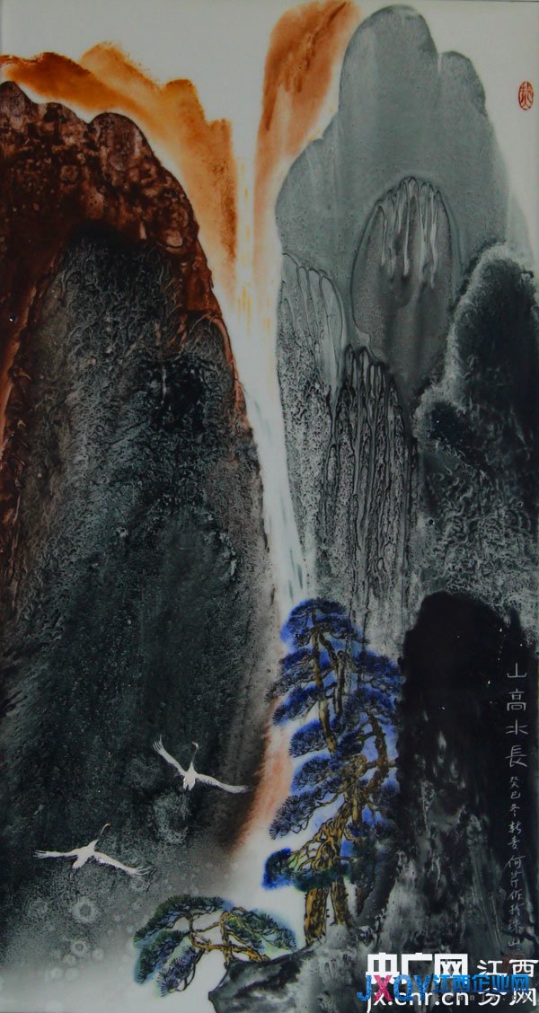 “進行陶瓷山水畫創作源自我從小的愛好,我自小生活在大山里,對大山、藍天、白云、流水有著一種由衷的眷戀。”李新青說,將對山水的喜歡表達在畫面上是一件充滿幸福的事。他筆下大山大水大墨大彩,正應了“天地有大美而不言”而美盡在其中。在作品《山高水長》中,他運用潑彩的手法表現出層層疊嶂的高山及刻畫綠樹青松,流水從高山而下,動中有靜,兩只仙鶴翩翩起舞于美景之中,高山、流水、青松代表情深、長遠,這是他對自己美好愛情生活的祝福和寄托。