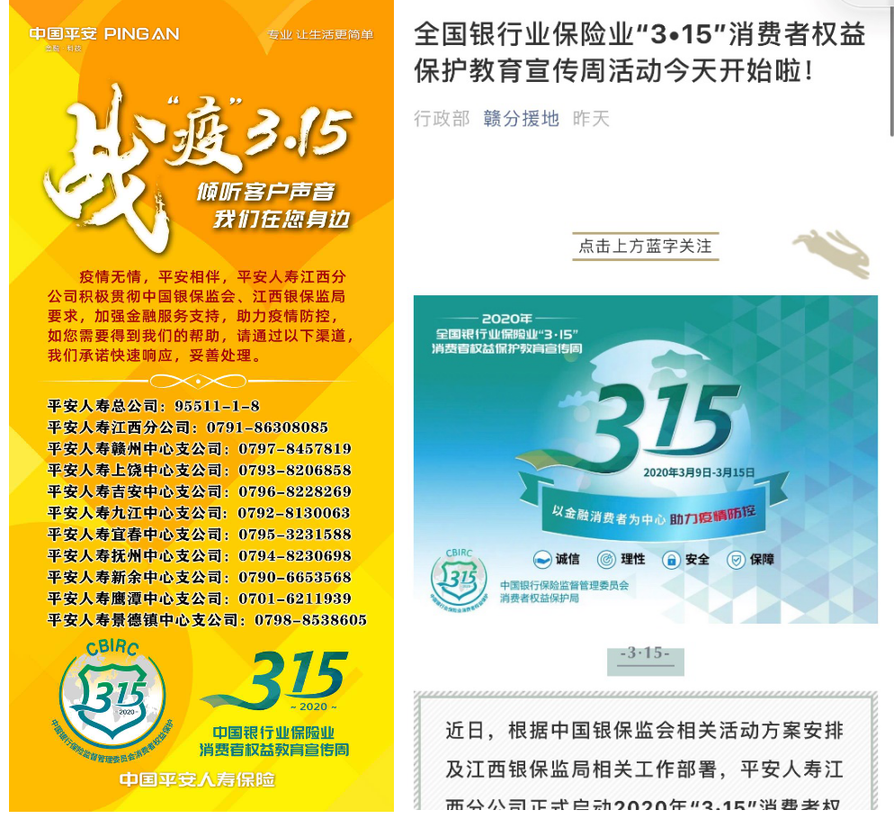江西企業網訊 近日,根據中國銀保監會相關活動方案安排及江西銀保監局相關工作部署,2020年“3.15”消費者權益保護教育宣傳周活動已正式啟動。平安人壽江西分公司積極響應號召,結合當前特殊疫情形式通過多種線上渠道開展“以消費者為中心助力疫情防控”為主題的宣傳教育活動,以提升保險消費者金融素養為己任,在提高消費者風險防范意識和自我保護能力的同時,持續推動保險行業消費者權益保護工作,做好新冠肺炎防疫期間的保險服務工作。