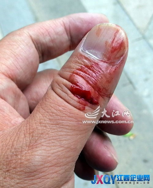見相機被摔,梁振堂上前想撿起相機,兩男子又圍過來要打他,不讓他拿相機。見兩男子氣焰如此囂張,梁振堂拿出手機準備報警,黃衣男子撿起摔在地上的鏡頭狠狠朝梁振堂砸去,梁振堂的左手大拇指頓時被砸得鮮血直流。