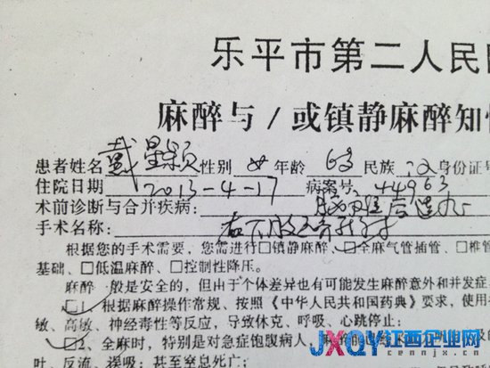 隨后記者找到了樂平市衛生局,醫政股副股長彭學東告訴記者,景德鎮市衛生局已經派人下來調查此事,目前還沒有調查結果,不過從已掌握的情況來看,醫院方面存在過失,就算寫病歷時出現錯誤需要當時更正,也必須在原字跡上劃兩條線,再到旁邊更正。“不能直接在病歷字跡方面做修改,包括病歷不嚴謹,外地專家會診不規范等問題已經暴露出來了。”