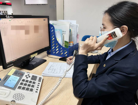 圖:工作人員通過電話回訪與失能人員家屬交流護理情況