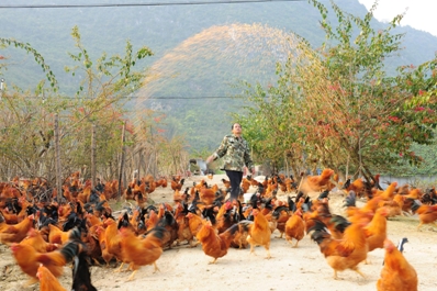 山里林多、花多、果園多,養雞正合適。在中國人壽扶持下,黃保全、隆小春夫婦引進花海生態土雞養殖項目,雞都在花下散養,以花瓣和昆蟲作為天然飼料,養出來的土雞肉質甜美鮮嫩,“我的基地年出欄土雞1萬羽以上,區內外客戶都到我這里買雞,訂單不斷,常年供不應求。”黃保全看著滿地紅彤彤的年雞,難掩喜悅之情。