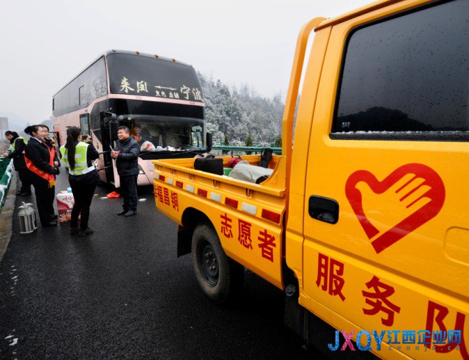 早已饑腸轆轆的車主見到標有“幸福昌銅志愿者服務隊”的車輛緩緩駛來后,被凍得僵硬的臉上也即刻展現了微笑。他介紹道,他是湖北人,叫彭大環,是東風客運公司的司機,從浙江前往湖北,因為昌銅高速這邊路況好,路途近很多,可以省些費用,所以經常走這條路,已經是昌銅高速的常客了。但是,沒想到車子今天突然出現故障,熄火無法啟動,而車子線路又比較復雜,需要公司專門服務站修理,這才被迫困在高速上。而且,自己已經開了一夜的車,現在是又餓又困。
