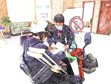 “您好!請問您需要辦理什么業(yè)務(wù)?”王劍習(xí)慣性回應(yīng)道。只見那個阿姨坐在輪椅上,身體縮成了一團,孤零零一人在門口。見狀,王劍和同事呂霞馬上默契地快速走出門去迎接。